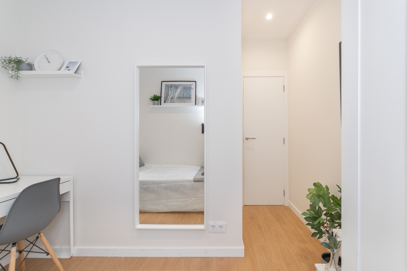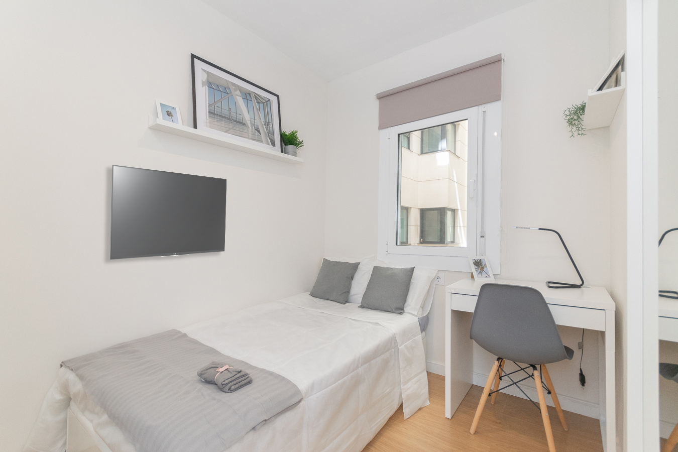 Deluxe room interor con cama sencilla, mesita de noche, escritorio con lámpara de lectura, silla de estudio, armario grande y Smart tv. Dispone de una gran ventana luminosa hacia el patio interior. Cuenta con estantes, elementos decorativos de diseño, un reloj de pared y bonitas plantas que hacen de la estancia un espacio armónico y lleno de vida. Su ubicación se encuentra al lado de la cocina. La habitación tiene un tamaño de 10m2.