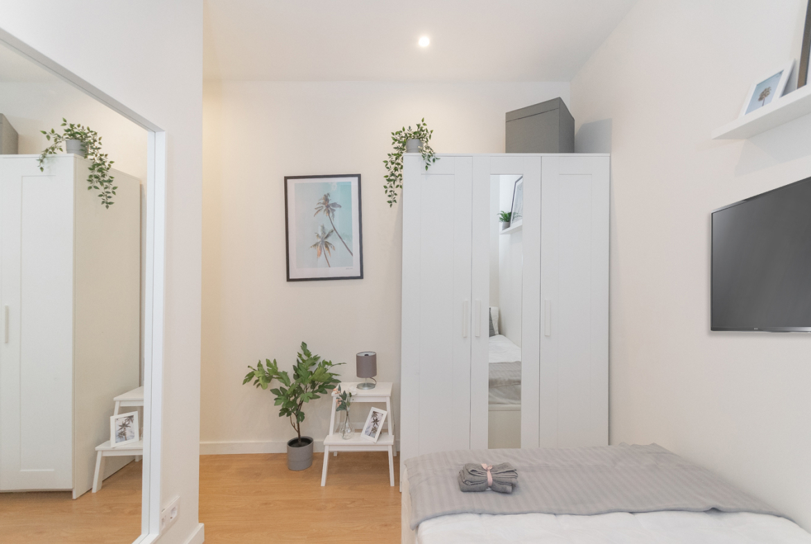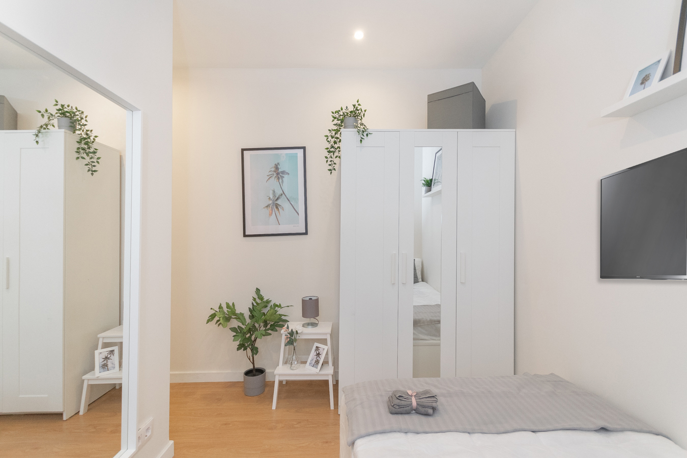 Deluxe room with single bed, bedside table, desk with reading lamp, study chair, large wardrobe and Smart TV. It has a large bright window to the interior patio. It has shelves, decorative design elements, a wall clock and beautiful plants that make the room a harmonious space full of life. Its location is next to the kitchen. The room has a size of 10m2.